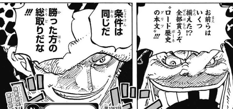 獲る→獲得。正攻法で手に入れる。努力して手に入れる。ある意味カイドウとビッグマムには似つかわしくない言葉。互いに1つずつ持っていた事で2個確定。戦力的に見てもこの時期最もワンピースに近い組織だった。