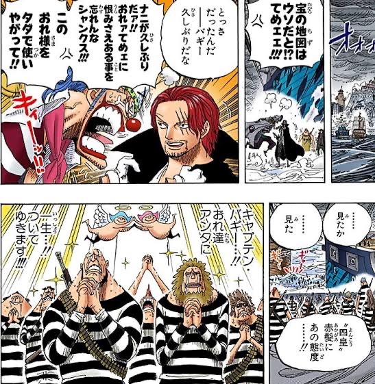 この判断に対してバギーは怒りを通り越して落胆。どんなに悪態をついてもシャンクスを認め、自身の夢を託していたバギーとしては当然の反応。